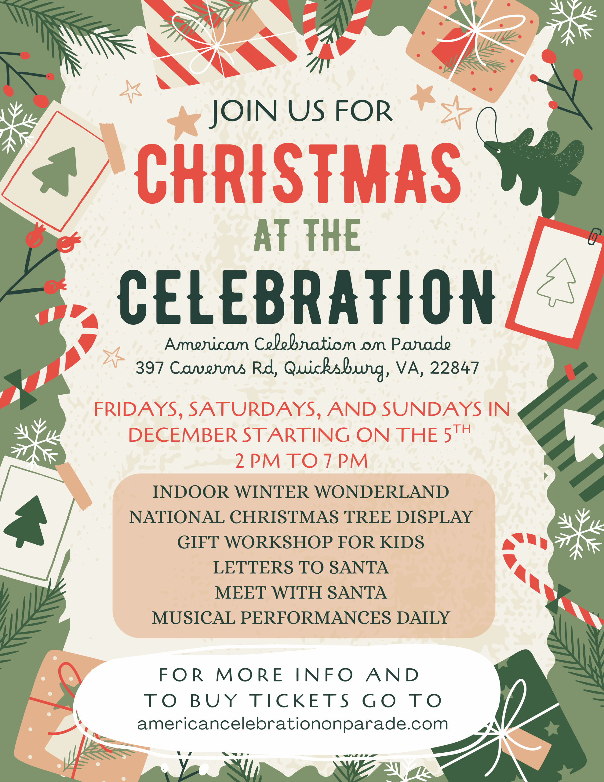 Enjoy a sparkling Christmas adventure indoors at American Celebration on Parade in Quicksburg, VA. Stroll among massive decorated floats, twinkling lights, and festive displays. Christmas at the Celebration is a magical holiday stop for families from near and far! Join us for daily musical performances, unique holiday displays, letters to Santa, and more!